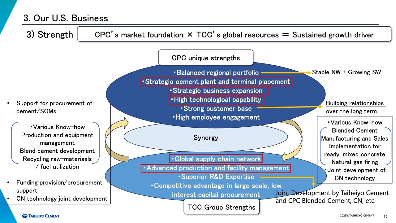Moving on to the second point, our business strategy. The key word comes down to one word: “synergy.” The strategy is built on the mutual synergistic effects between CalPortland Company (CPC) and TCC’s management resources.