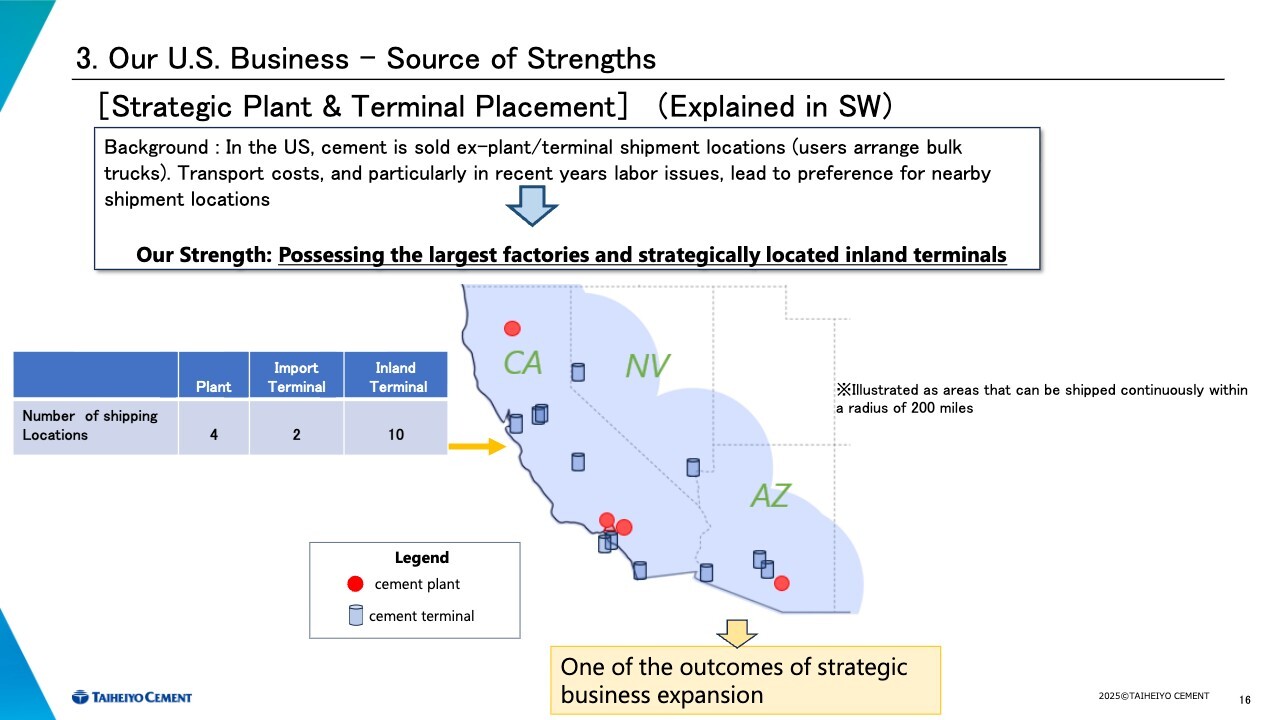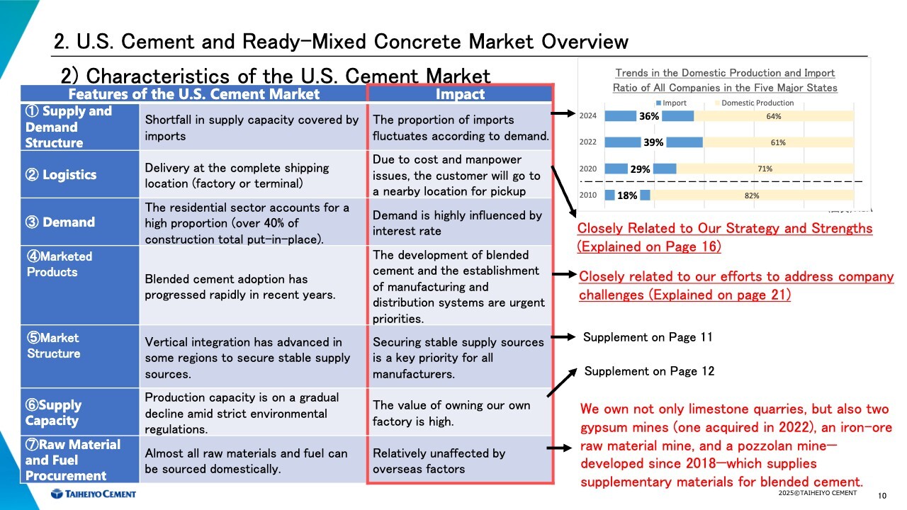 This slide lists characteristics of the U.S. cement market that differ from those in Japan. I will now elaborate on six key features, focusing on those relevant to our strategy and strengths.