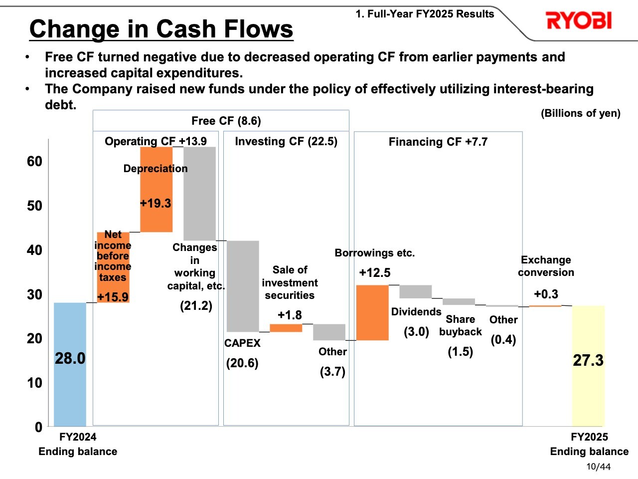 Consequently, the FY2025 ending balance of cash and cash equivalents stood at ¥27.3 billion, a decrease of approximately ¥0.7 billion from ¥28.0 billion at the end of the previous fiscal year.