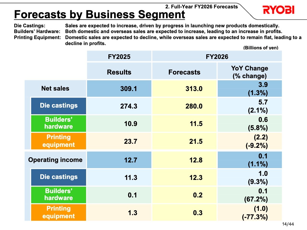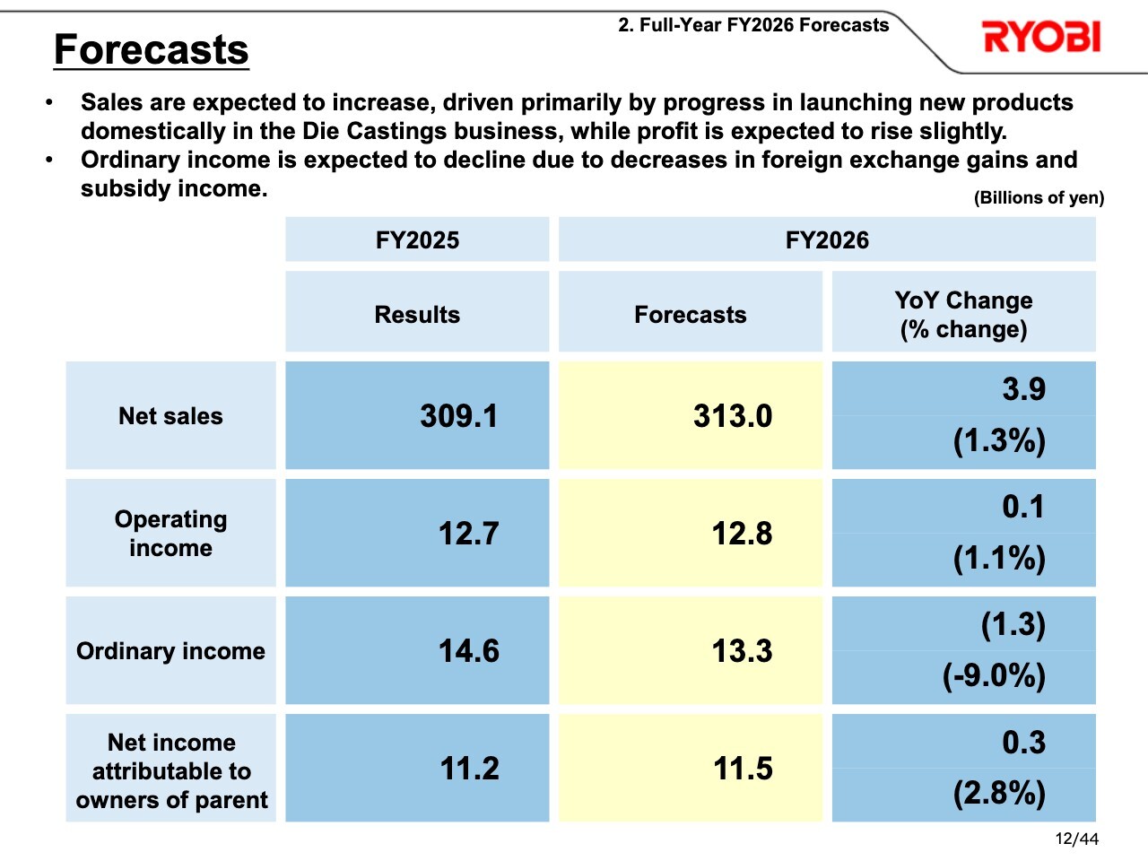 From here, I will explain the forecast for FY2026. Net sales for FY2026 are projected to be ¥313.0 billion, representing a YoY increase of ¥3.9 billion.