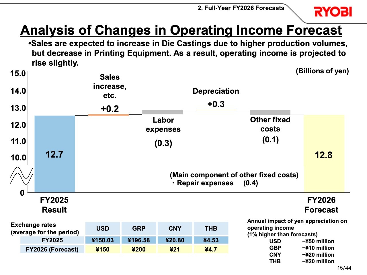 This slide shows the analysis of changes in the operating income forecast. Operating income is expected to increase from ¥12.7 billion in FY2025 to ¥12.8 billion in FY2026, representing an increase of ¥0.1 billion. Although labor expenses and other fixed costs are expected to increase, these increases are expected to be offset by lower depreciation expenses and higher sales, resulting in an increase in operating income of ¥0.1 billion, which we view as largely flat.