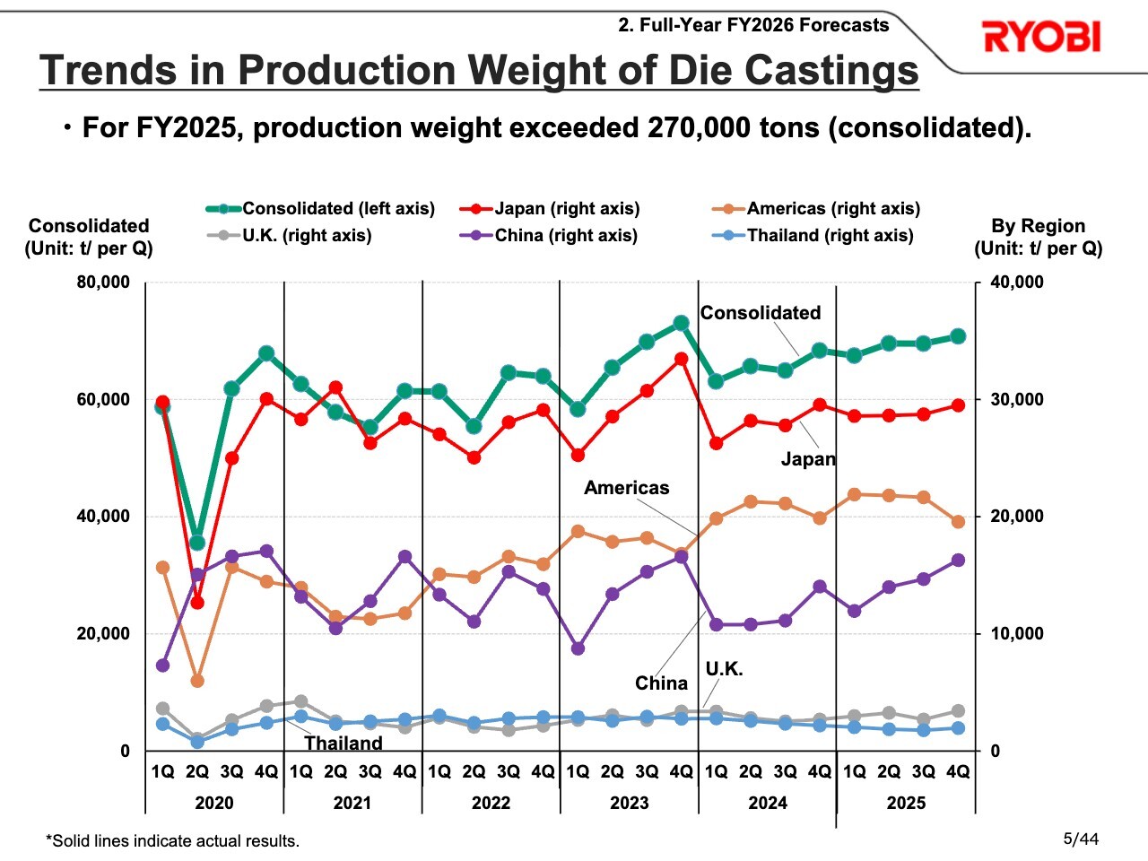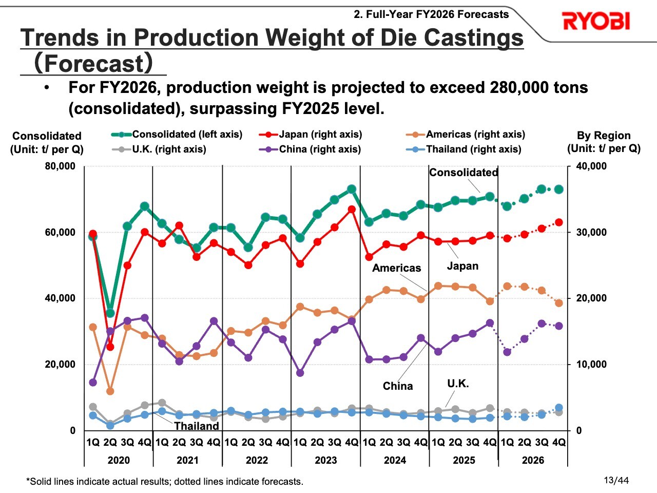 Question: Regarding the trends in production weight of die castings on page 13 of the document, it is mentioned that production in Japan will rise significantly in the latter half of this year and exceed 30,000 tons in the fourth quarter. Could you explain the factors driving this growth and which projects are contributing to it?