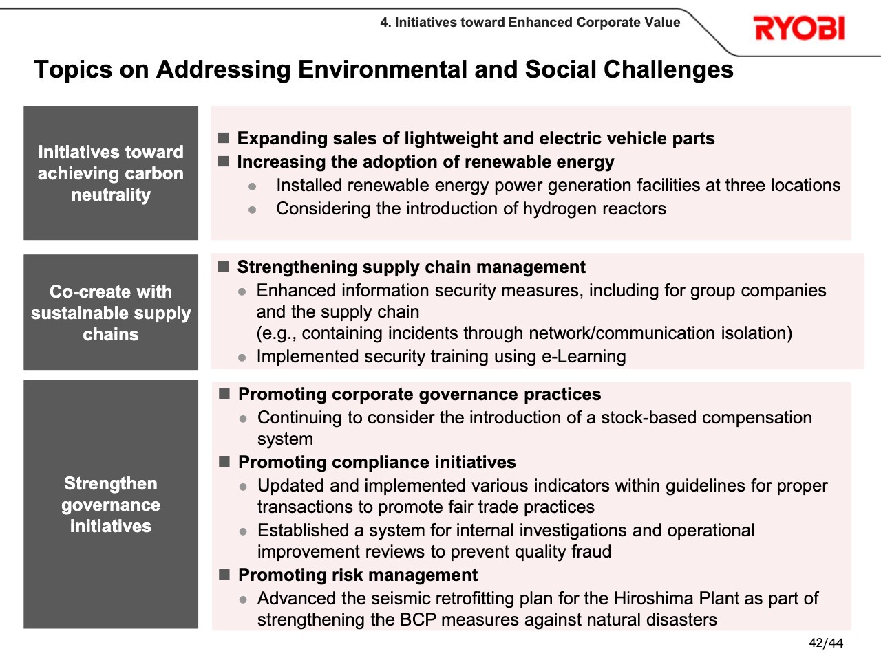 This section covers our initiatives to address environmental and social challenges. As a key measure toward achieving carbon neutrality, we have decided to install renewable energy power generation facilities at three new locations and are actively implementing this initiative. In addition, as part of strengthening supply chain management, we are prioritizing information security measures as a critical focus area.
