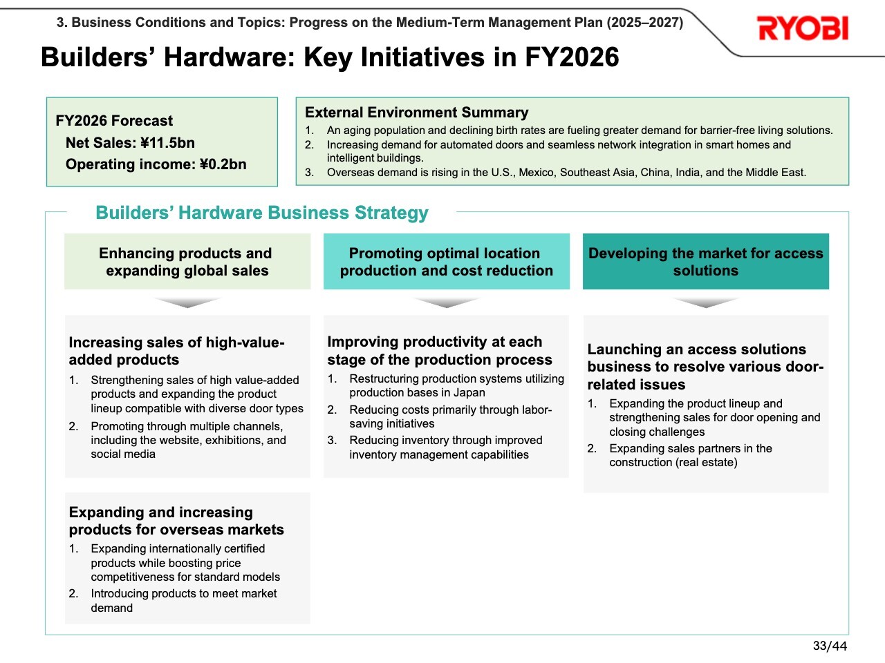 These are the key initiatives for the Builders’ Hardware business in FY2026. Continuing from 2025, we will advance the three business strategies and promote the specific initiatives presented on the slide. In particular, we have positioned cost reduction and the expansion of overseas markets as our two main themes. We will also focus on expanding the product lineup and applications of the RUCAD electric door opening/closing device.