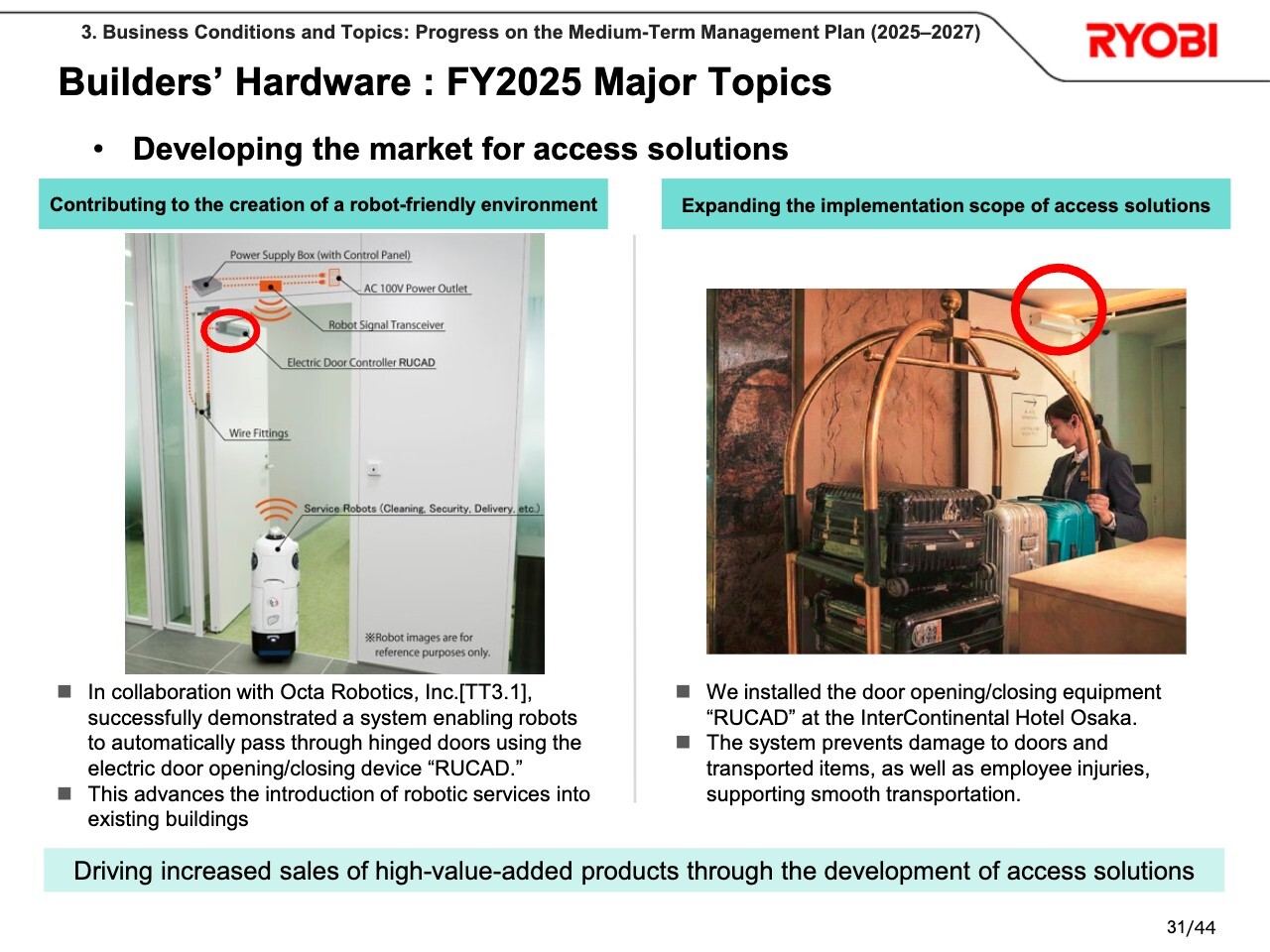 As a concrete example, in the Builders’ Hardware business, we are working to develop the access solutions market to drive increased sales of high-value-added products. As shown on the left side of the slide, to contribute to creating a robot-friendly environment, we successfully demonstrated a system in collaboration with Octa Robotics, Inc., enabling a robot to automatically pass through a hinged door using our RUCAD electric door opening/closing device.