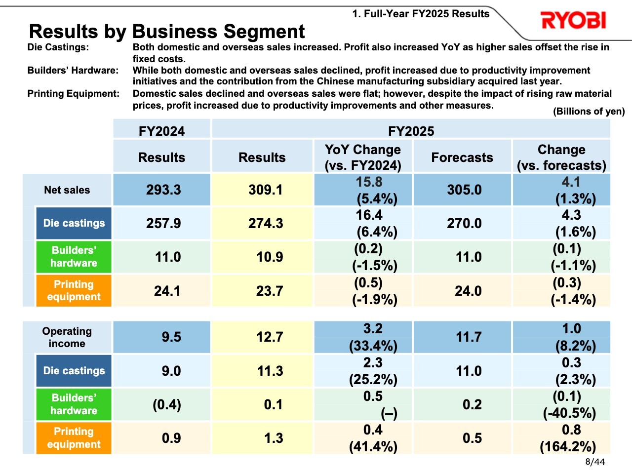 Looking at the financial results announced yesterday by business segment, the Die Castings business—supported by a recovery in automobile production—as well as the Printing Equipment business for overseas markets recorded year-on-year increases in sales. On the other hand, sales declined in the Builders’ Hardware business and in Printing Equipment for the domestic market.