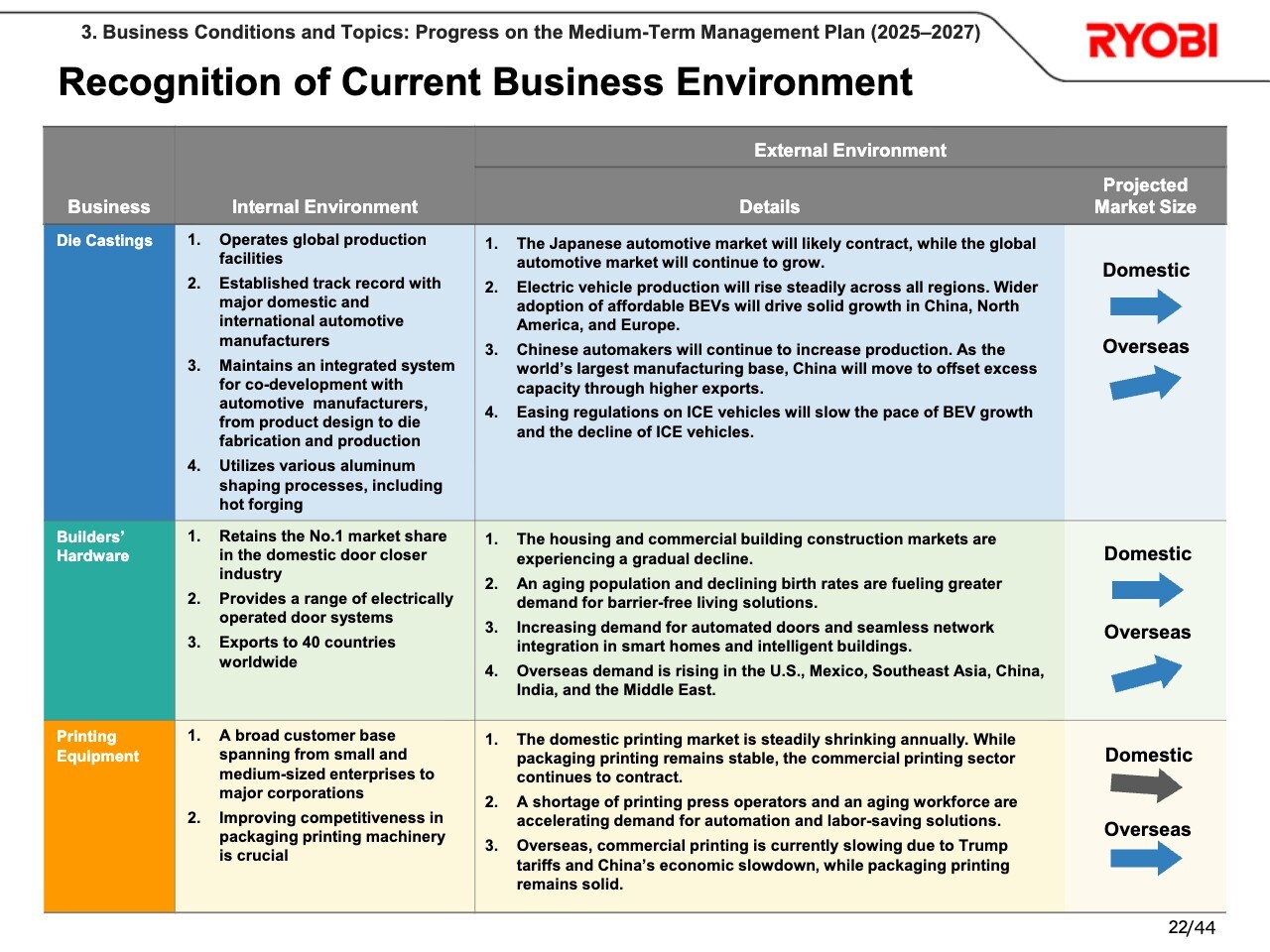 This slide outlines our recognition of the current business environment. Compared with the time of the Medium-Term Management Plan announcement one year ago, our outlook for overseas markets in the Die Castings business has been revised to be somewhat more conservative, reflecting the slowing pace of growth in electric vehicles (BEVs).