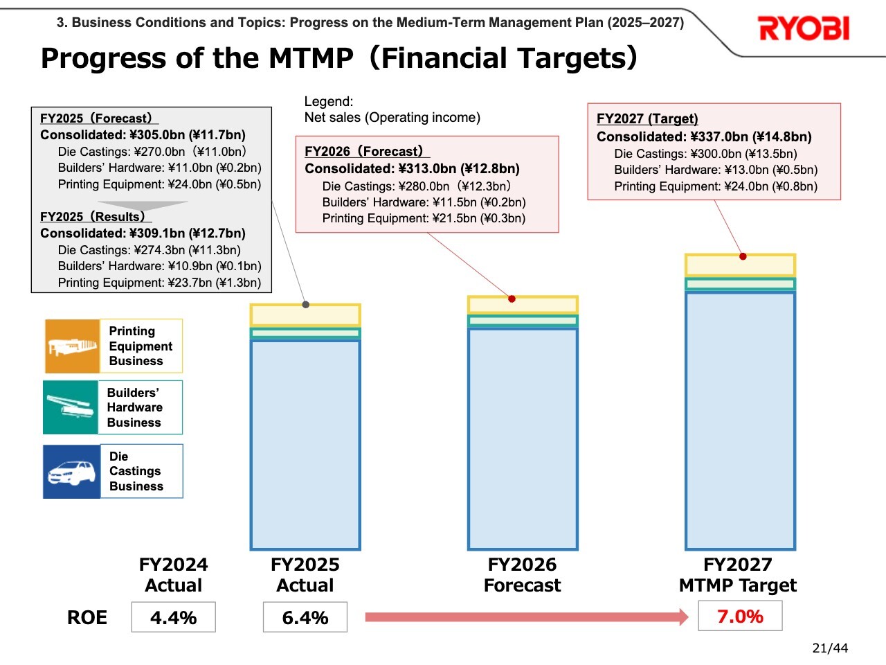This slide shows the progress on our financial targets. In FY2025, the first year of the Medium-Term Management Plan, both consolidated net sales and consolidated operating income exceeded our initial targets. ROE improved by approximately 2 percentage points from the previous fiscal year, reaching 6.4%.