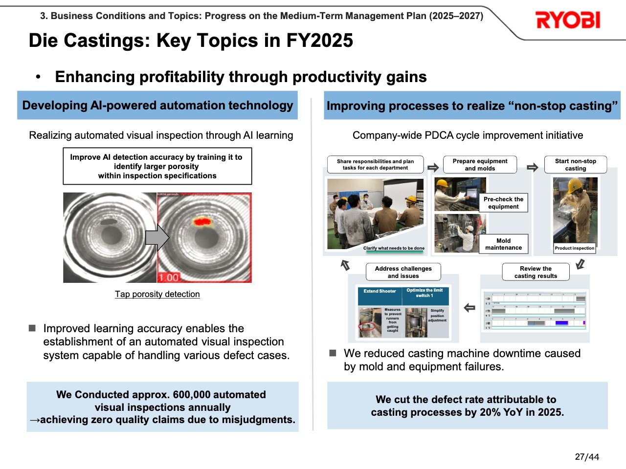 Regarding enhancing profitability through productivity gains, we are advancing AI-based automated visual inspection. As shown on the left side of the slide, by improving AI learning accuracy, we have established an automated visual inspection system capable of handling various defect cases. In FY2025, we conducted approximately 600,000 automated visual inspections annually, achieving zero quality claims due to misjudgments.