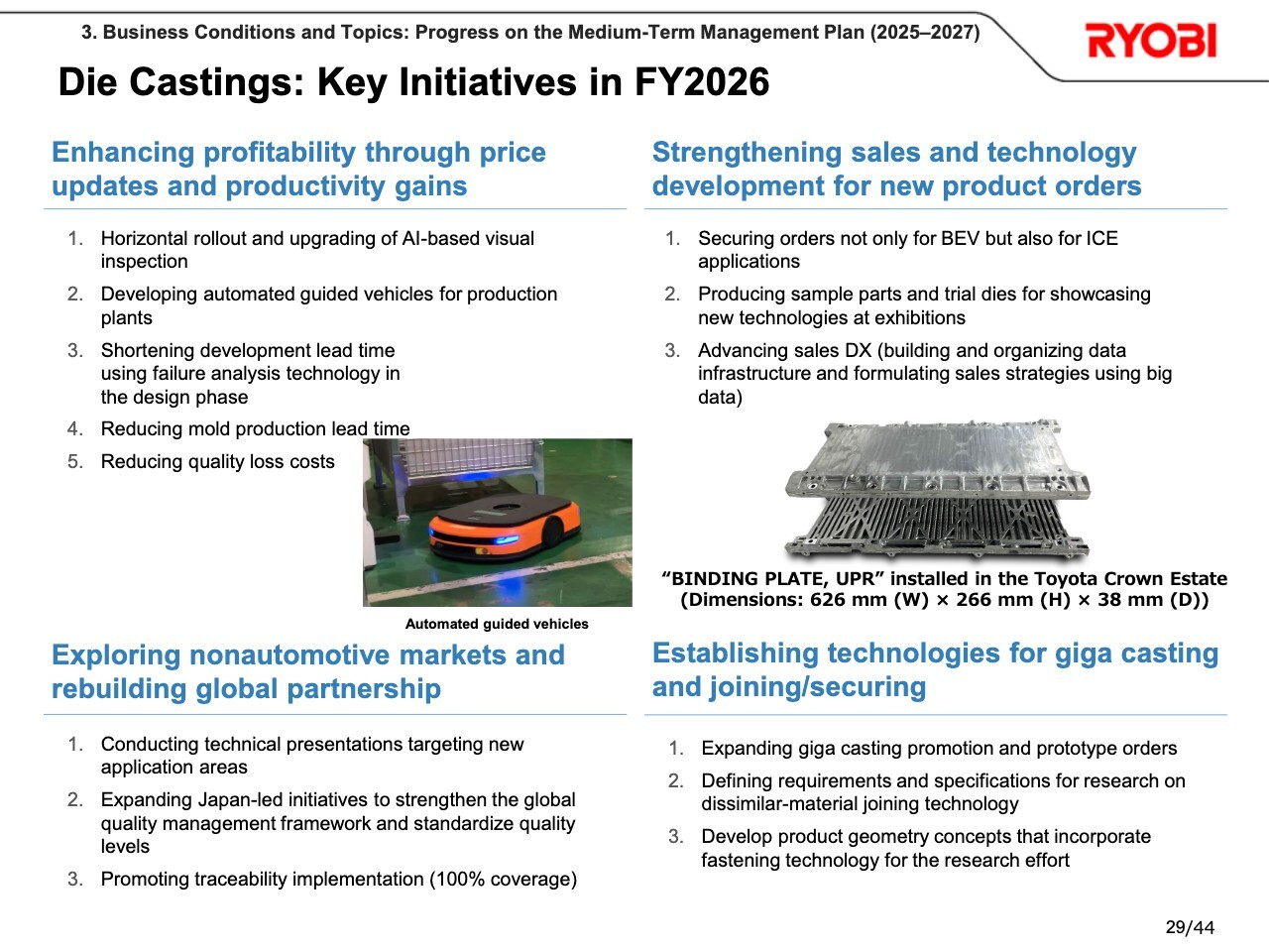 The initiatives shown here are continuations from FY2025. One specific example is productivity improvement through the use of automated guided vehicles, as shown on the slide. The photo on the right shows a strategic product for hybrid vehicles, and we are strengthening sales and technology development for new product orders targeting such products. We will continue these initiatives toward achieving the targets of the Medium-Term Management Plan.
