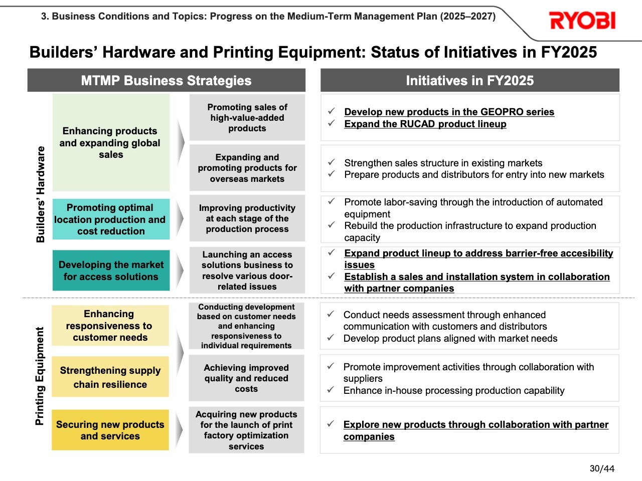 In the Builders’ Hardware business, we are focusing on enhancing products, promoting optimal location production and cost reduction, and developing the market for access solutions. In the Printing Equipment business, our business strategies include enhancing responsiveness to customer needs, strengthening supply chain resilience, and securing new products and services, and the initiatives to address these strategies are shown on the right side of the slide.