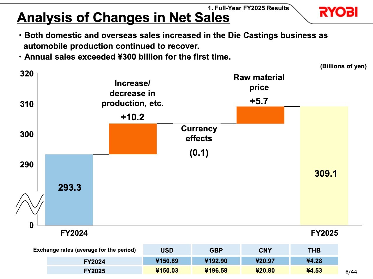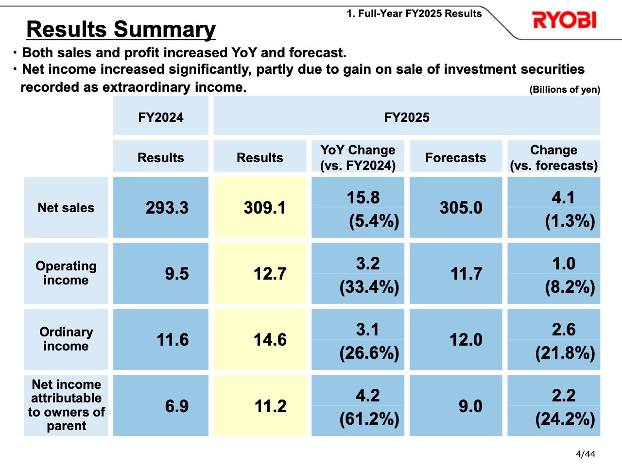 First, let me walk you through the Full-Year FY2025 Results. This slide provides a summary of the FY2025 results. Net sales amounted to ¥309.1 billion, a YoY increase of ¥15.8 billion. Compared with the forecast of ¥305.0 billion announced on February 13 last year, net sales exceeded the forecast by ¥4.1 billion.