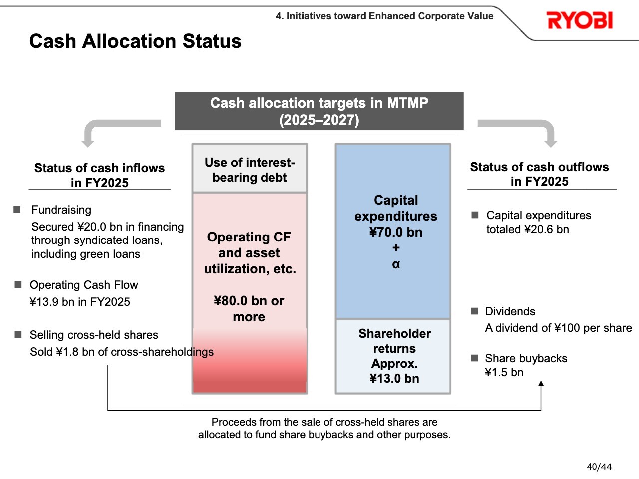 This slide shows the status of cash allocation. Regarding cash inflows, in line with our policy of effectively utilizing interest-bearing debt, the Company executed ¥20.0 billion in long-term borrowings in September 2025. Operating cash flow amounted to ¥13.9 billion, and the Company also sold ¥1.8 billion of cross-shareholdings to enhance asset efficiency.