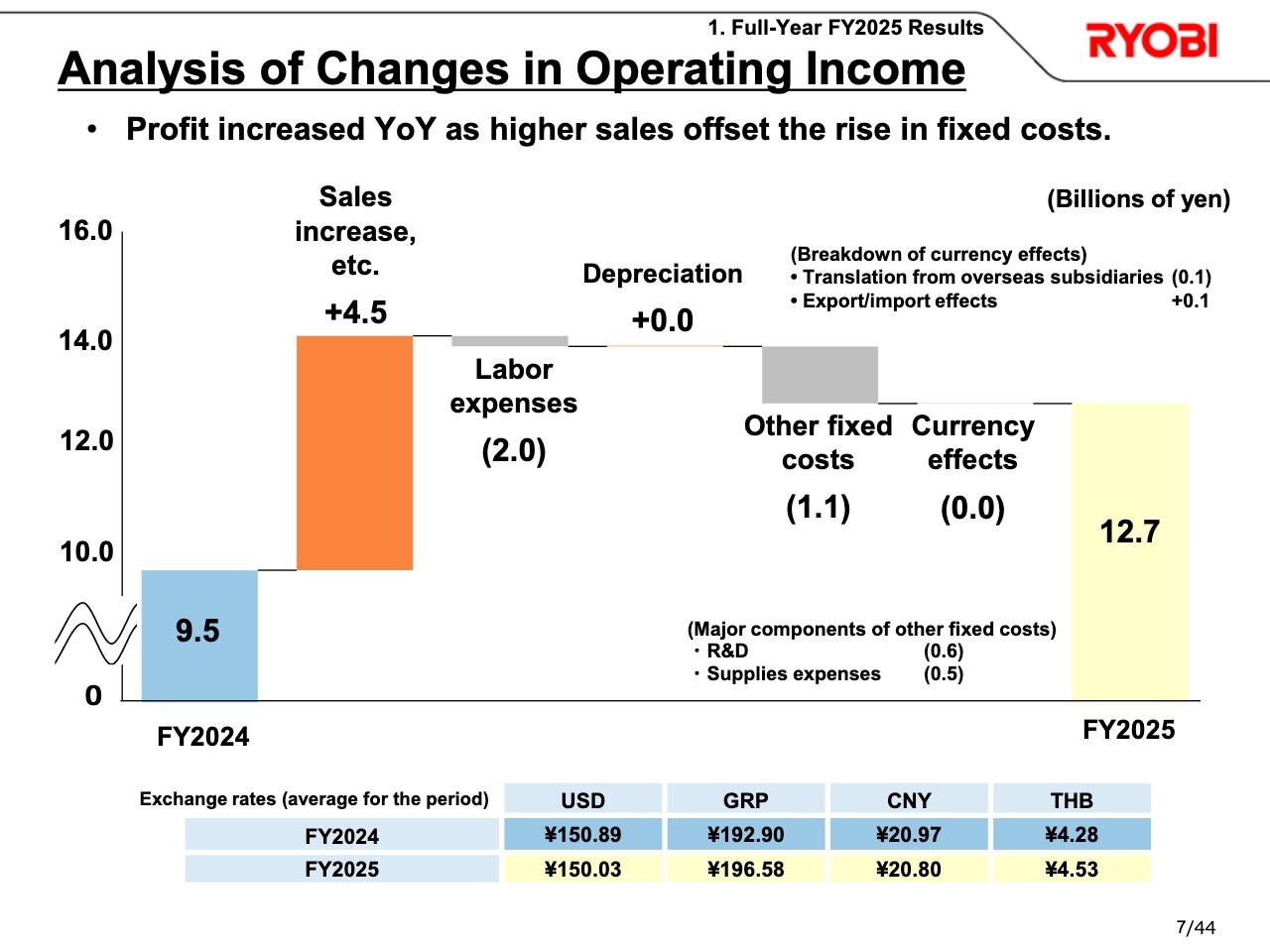 During the consolidated fiscal year under review, the business environment remained uncertain due to factors such as the impact of trade policies in various countries, volatile foreign exchange rates, and persistently high resource and energy prices. Under these circumstances, in addition to proactive sales activities, the Ryobi Group worked to reduce costs and improve productivity.