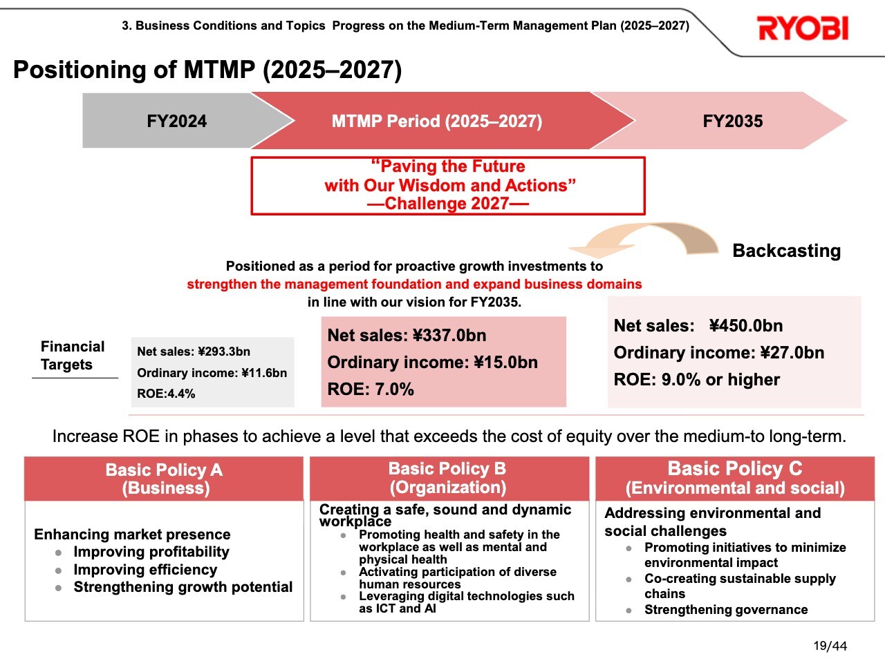 In the final year of the plan, FY2027, we are targeting net sales of ¥337.0 billion, ordinary income of ¥15.0 billion, and an ROE of 7.0%.