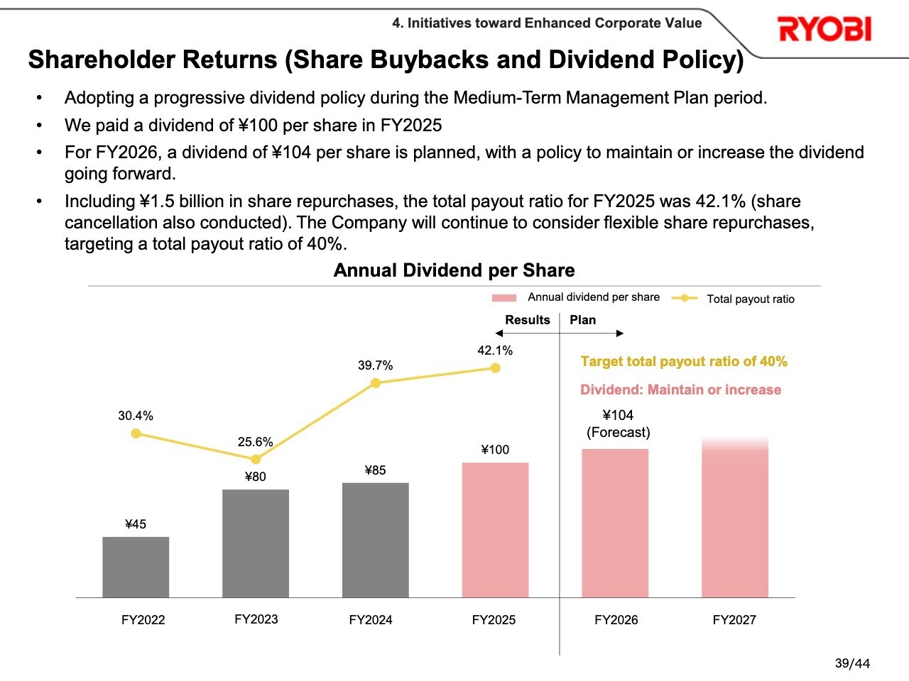 Let me now turn to shareholder returns. The Company has revised its existing shareholder return policy and adopted a progressive dividend policy during the period of the Medium-Term Management Plan, targeting a total payout ratio of 40%. In FY2025, the first year of the plan, we paid a dividend of ¥100 per share, up ¥15 from the previous year. For the current fiscal year, FY2026, we plan to increase the annual dividend per share by ¥4 to ¥104.