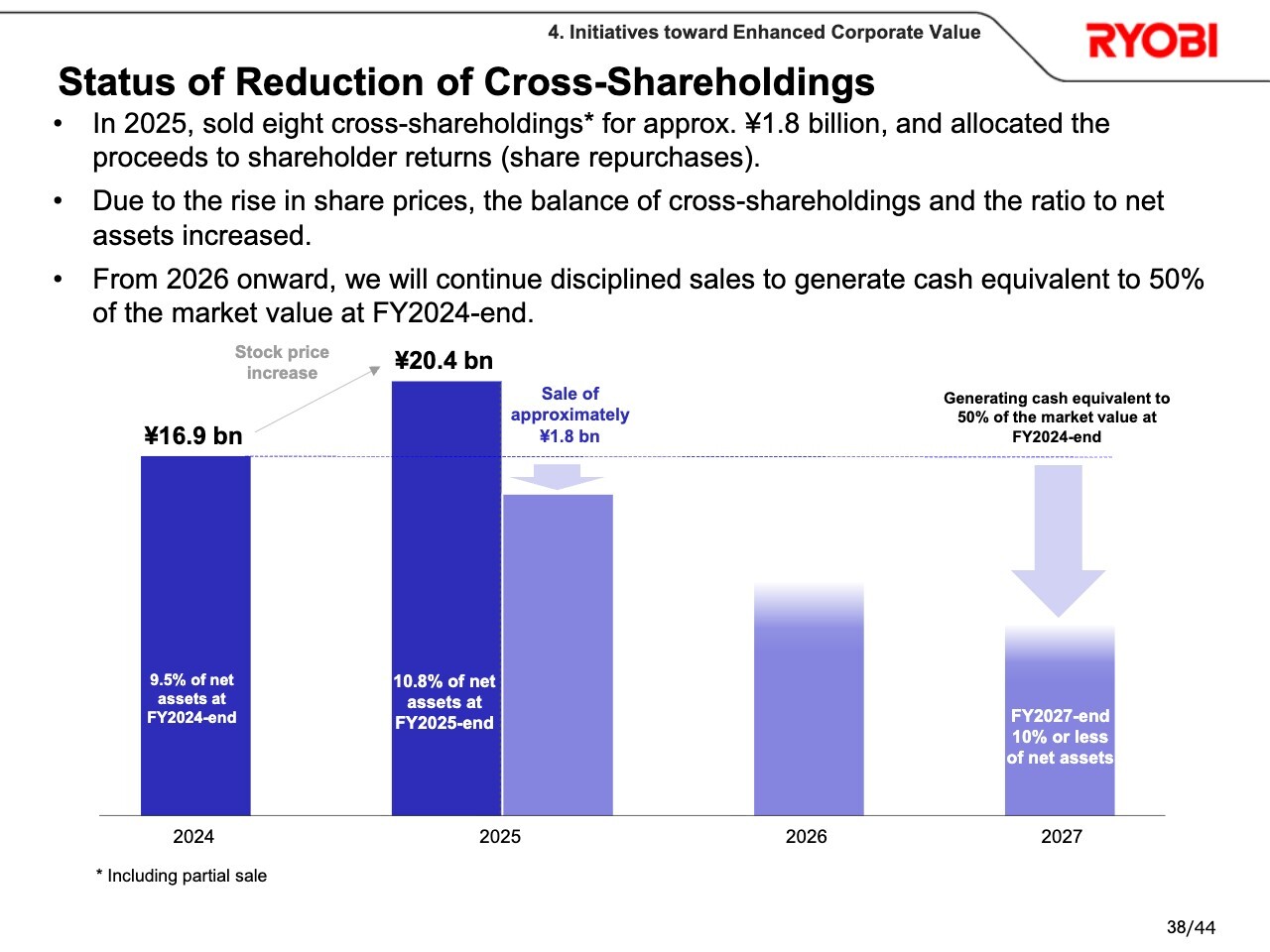This is the status of the reduction of policy shareholdings. In 2025, we sold approximately ¥1.8 billion across eight issues, mainly in financial institutions. The proceeds from these sales were allocated to share repurchases as part of our shareholder return program. On the other hand, due in part to the recent rise in stock prices, the balance of policy shareholdings increased to ¥20.4 billion. From 2026 onward, we will continue disciplined sales of policy shareholdings.