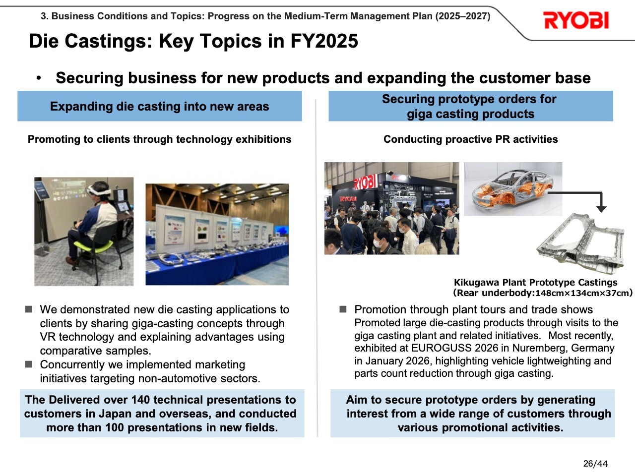 This slide shows concrete examples of our initiatives. In order to secure business for new products and expand our customer base, we conduct technology exhibitions for customers, including those in non-automotive sectors. By sharing visual concepts through VR technology and other tools, we promote new potential applications for die casting, as well as the comparative advantages of die casting products. During FY2025, we delivered more than 140 technical presentations to customers in Japan and overseas, and conducted over 100 presentations in new fields.