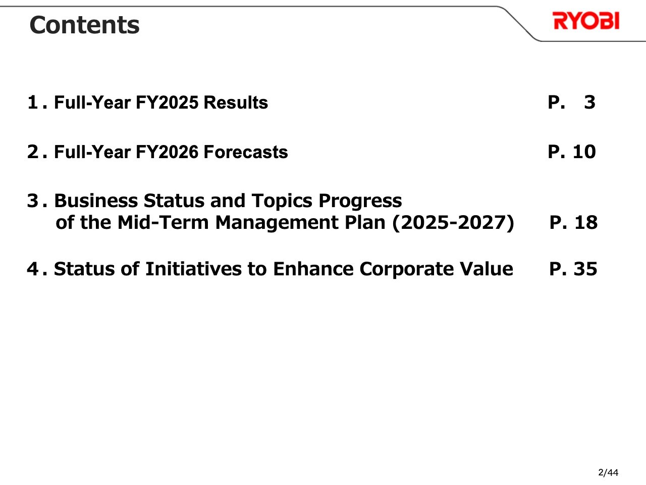 Hiromu Arihiro (hereinafter, Arihiro): I am Arihiro, Corporate Officer and General Manager of the Finance Department. Today, we will go through the four items listed in the table of contents. I will cover the first two items, Full-Year FY2025 Results and Full-Year FY2026 Forecasts.